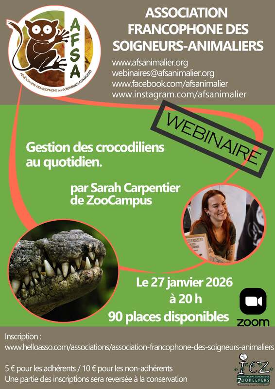 Sarah présentera les différentes espèces de crocodiliens dans le monde, en abordant leur biologie, leur reproduction, leur alimentation, ainsi que les conditions et enclos nécessaires à leur maintien en captivité.