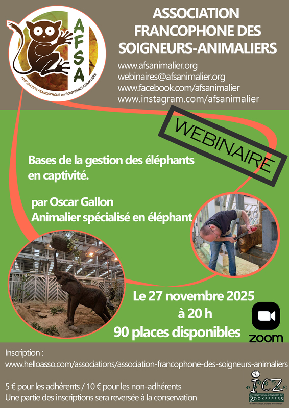 Le prochain webinaire aura lieu le jeudi 27 novembre à 20h. Il sera animé par Oscar Gallon, qui nous présentera tout ce qu’il faut savoir sur la gestion quotidienne des éléphants en captivité, qu’ils soient d’Afrique ou d’Asie : alimentation, reproduction, aménagement des enclos, biologie, soins, et bien plus encore.